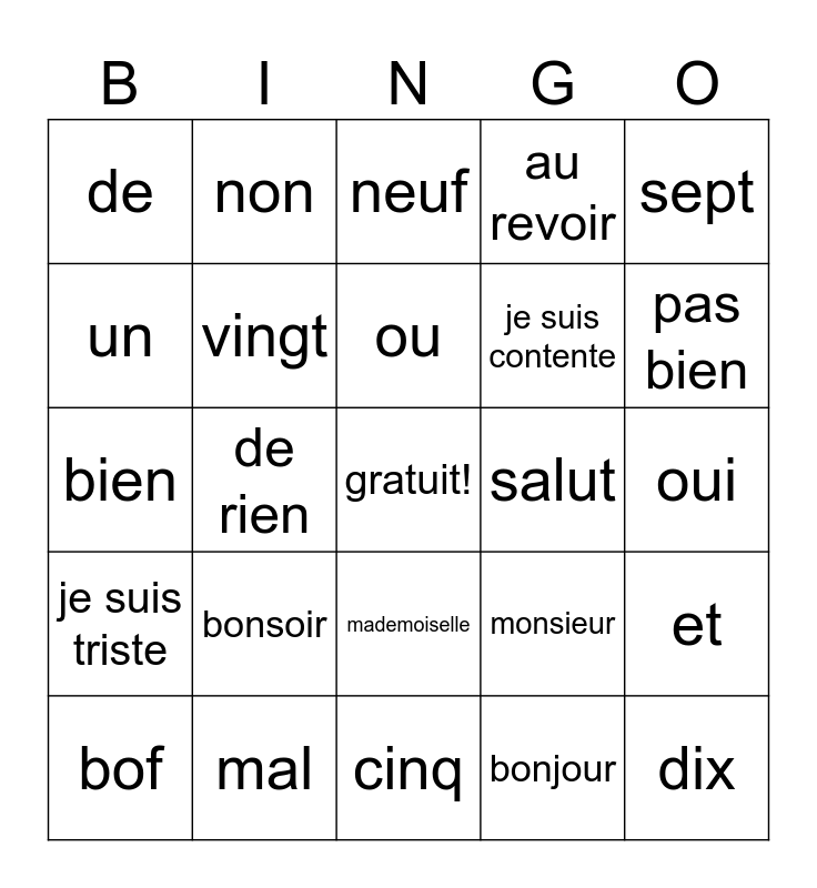 This bingo card has a free space and 24 words: bonsoir, mal, ou, bof, sept, de, un, non, salut, mademoiselle, je suis contente, bien, monsieur, et, vingt, bonjour, oui, neuf, pas bien, de rien, dix, je suis triste, au revoir and cinq.