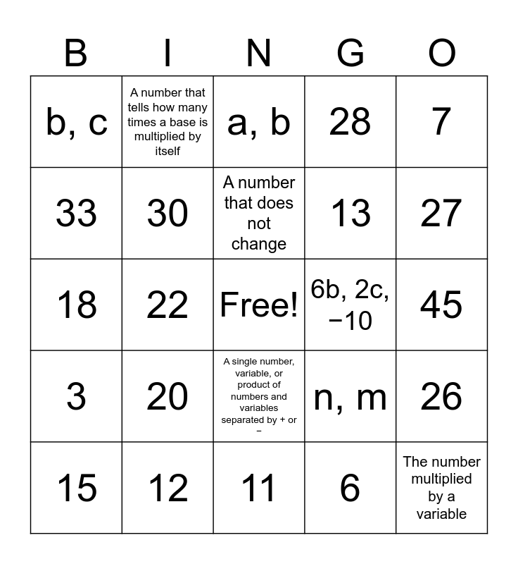This bingo card has a free space and 68 words: −9, The number multiplied by a variable, 24, 4, A letter that represents an unknown number, 25, A number that tells how many times a base is multiplied by itself, 2, A number that does not change, 11, A single number, variable, or product of numbers and variables separated by + or −, 3, 4, 45, 7, 5, 33, 22, b, c, 35, 20, 13, n, m, 3, 16, 9, r, s, 14, 30, 26, 6, a, b, 8, 2, 4p, 3q, −15, 28, −6, 2, 15, 27, 18, 4, 40, 30, 5, 21, 14, t, u, 8, −2, 6b, 2c, −10, 12, 18, 6, 8, 11, 5y, −9, 3, 2, 6, p, q, 9, 32, 34, 36, 38, 40, 42, 44, 46 and 48.