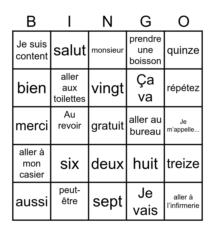 This bingo card has a free space and 24 words: six, peut-être, vingt, aussi, quinze, Je suis content, bien, salut, aller au bureau, deux, Ça va, merci, huit, treize, aller aux toilettes, Je vais, Je m’appelle..., monsieur, répétez, Au revoir, aller à l’infirmerie, aller à mon casier, prendre une boisson and sept.