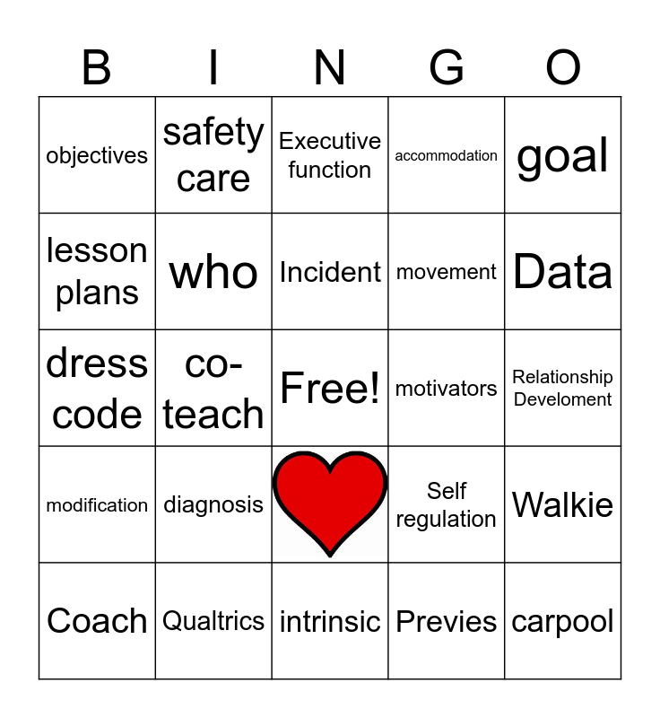 This bingo card has 1 images, a free space and 25 words: Previes, Incident, Qualtrics, goal, objectives, lesson plans, safety care, Relationship Develoment, Self regulation, movement, dress code, Walkie, Coach, co-teach, ability, accommodation, modification, Executive function, carpool, Data, intrinsic, motivators, diagnosis, who and people.