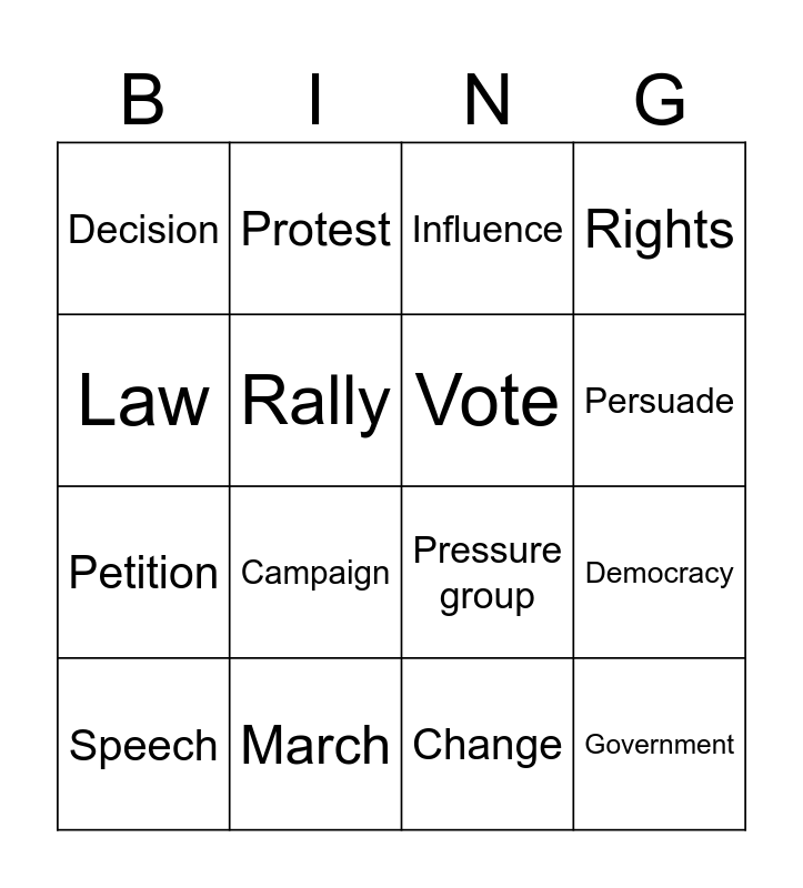 This bingo card has 19 words: Pressure group, Lobbying, Influence, Government, Democracy, Law, Change, Decision, Protest, Petition, Campaign, Rally, Vote, March, Speech, Equality, Rights, Persuade and Support.
