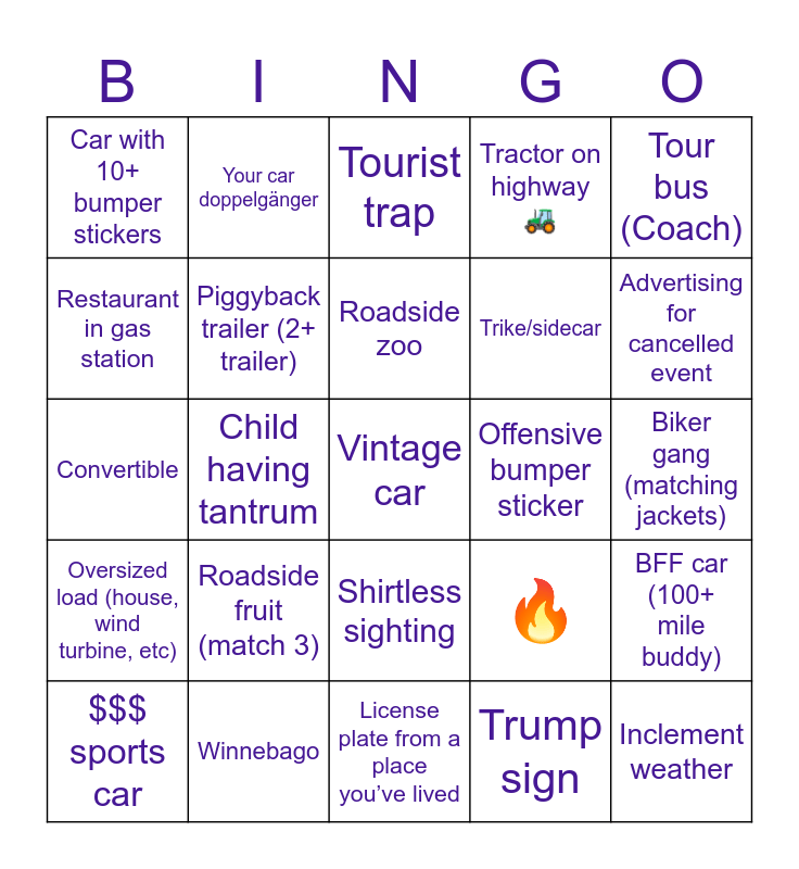 This bingo card has 32 words: Trump sign, Truck with gun rack, Child having tantrum, Military, Oversized load (house, wind turbine, etc), Piggyback trailer (2+ trailer), Tour bus (Coach), BFF car (100+ mile buddy), Your car doppelgänger, Inclement weather, Roadside zoo, Tourist trap, 🌽, Hitchhiker, Offensive bumper sticker, MAGA hat, $$$ sports car, Convertible, Shirtless sighting, Roadside fruit (match 3), 🔥, UFO/aerial advertising, Biker gang (matching jackets), Winnebago, Vintage car, Tractor on highway 🚜, Trike/sidecar, Restaurant in gas station, Car with 10+ bumper stickers, License plate from a place you’ve lived, Someone driving with mask on and Advertising for cancelled event.