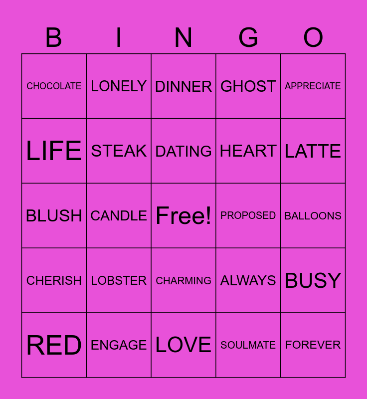 This bingo card has a free space and 29 words: RED, VALENTINE, CANDLE, ROSES, CHOCOLATE, DINNER, STEAK, LOBSTER, PROPOSED, ENGAGE, BALLOONS, FOREVER, LOVE, SOULMATE, LATTE, ADMIRE, CHARMING, CHERISH, APPRECIATE, BLUSH, ALWAYS, BLESSINGS, HEART, LIFE, GHOST, LONELY, BUSY, DATING and SPOUSE.