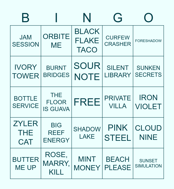 This bingo card has a free space and 24 words: BIG REEF ENERGY, ROSE, MARRY, KILL, SOUR NOTE, BUTTER ME UP, FORESHADOW, JAM SESSION, IVORY TOWER, ORBITE ME, PRIVATE VILLA, SHADOW LAKE, SILENT LIBRARY, BOTTLE SERVICE, PINK STEEL, CLOUD NINE, BURNT BRIDGES, BEACH PLEASE, IRON VIOLET, BLACK FLAKE TACO, SUNKEN SECRETS, THE FLOOR IS GUAVA, SUNSET SIMULATION, ZYLER THE CAT, CURFEW CRASHER and MINT MONEY.