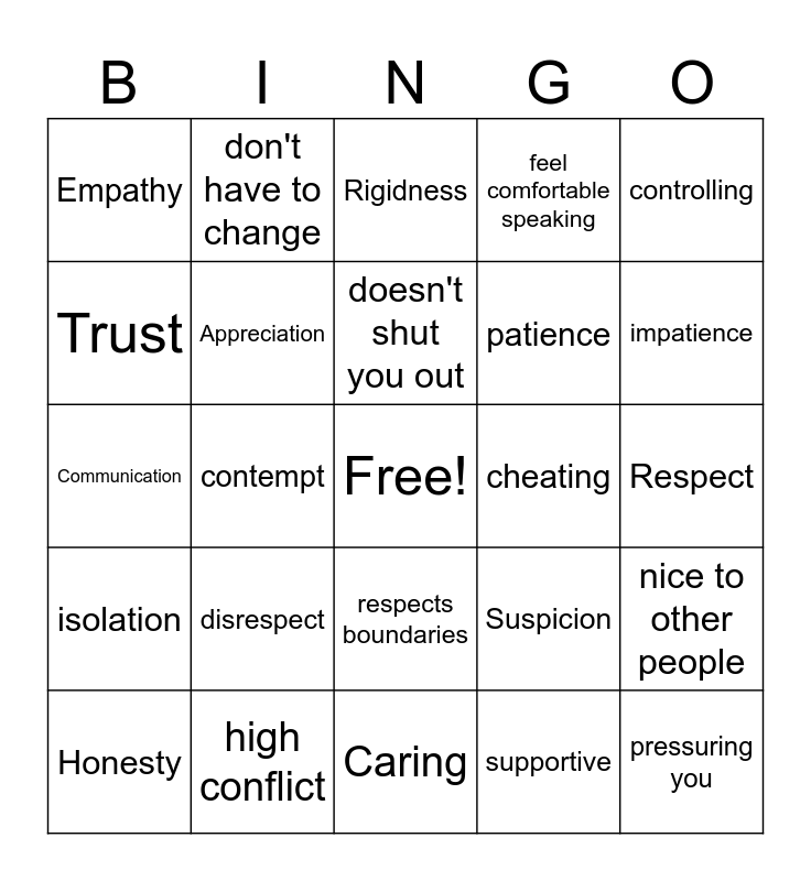 This bingo card has a free space and 29 words: Honesty, flexibility, contempt, rigid, Empathy, Rigidness, Appreciation, disrespect, cheating, high conflict, Respect, pressuring you, Caring, supportive, impatience, High critical, respects boundaries, isolation, controlling, Communication, Suspicion, gaslight, patience, Trust, feel comfortable speaking, don't have to change, nice to other people, doesn't shut you out and cheerleader.