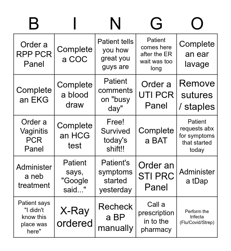 This bingo card has a free space and 24 words: Patient says, "Google said...", X-Ray ordered, Patient comments on "busy day", Patient says "I didn't know this place was here", Complete an ear lavage, Order a RPP PCR Panel, Complete an EKG, Complete a COC, Complete a BAT, Patient's symptoms started yesterday, Order a UTI PCR Panel, Order a Vaginitis PCR Panel, Order an STI PRC Panel, Administer a tDap, Complete a blood draw, Call a prescription in to the pharmacy, Patient requests abx for symptoms that started today, Patient tells you how great you guys are, Remove sutures / staples, Complete an HCG test, Perform the trifecta (Flu/Covid/Strep), Administer a neb treatment, Patient comes here after the ER wait was too long and Recheck a BP manually.