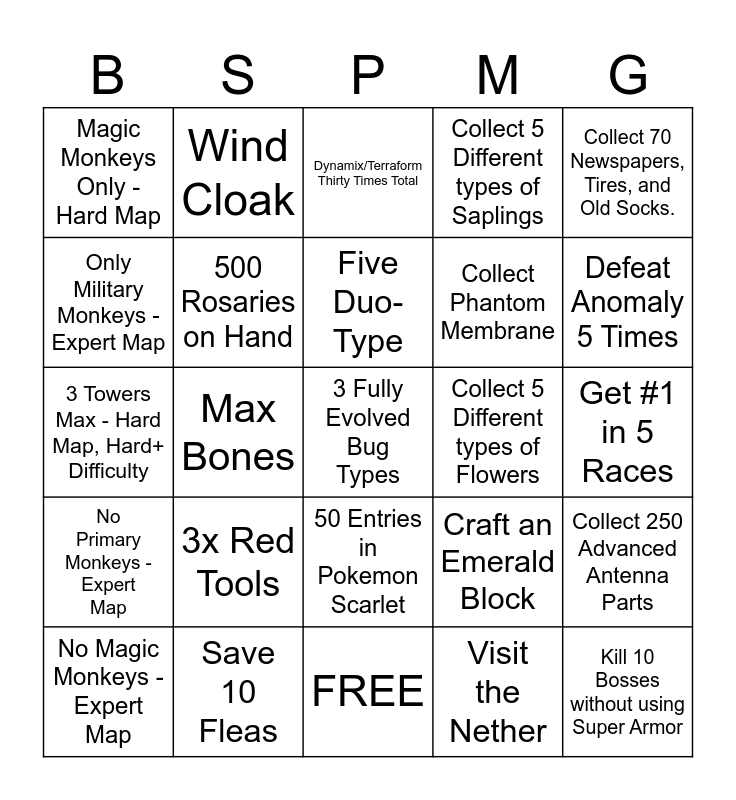 This bingo card has 50 words: Primary Monkeys Only - Hard Map, Save 10 Fleas, Second Evo Starter, Make an Anvil, Get #1 in 5 Races, Military Monkeys Only - Hard Map, Wind Cloak, Three Dark Types, Collect Phantom Membrane, Defeat 20 Mini-Bosses, Magic Monkeys Only - Hard Map, 500 Rosaries on Hand, 3 Fully Evolved Bug Types, Visit the Nether, Defeat the Mega-Guardian, Support Monkeys Only - Hard Map, Medium+ Difficulty, Max Bones, Five Duo-Type, Loot 3 Structure Chests, Collect 70 Newspapers, Tires, and Old Socks., 3 Towers Max - Hard Map, Hard+ Difficulty, New Crest, Dynamix/Terraform Thirty Times Total, Collect 5 Different types of Flowers, Collect 50 Crowns, Stopwatches, and Music Sheets, No Primary Monkeys - Expert Map, 3x Red Tools, Make 5 Sandwiches and Soups, Collect 5 Different types of Saplings, Collect 250 Advanced Antenna Parts, No Military Monkeys - Expert Map, 3x Blue Tools, Make 15 total [Sandwiches + Soups], Craft and Dye a full Leather Set of Armor, Defeat Grim 5 Times, No Magic Monkeys - Expert Map, 3x Yellow Tools, FREE, Tame a Horse or Wolf, Defeat Anomaly 5 Times, No Support Monkeys - Expert Map, 5x Requests, 50 Entries in Pokemon Scarlet, Kill a Skeleton with a Bow and Arrow, Kill 10 Bosses without using Super Armor, Only Military Monkeys - Expert Map, Tools x10, 50 Entries in Pokemon Shield, Craft an Emerald Block and Participate in 25 Races.