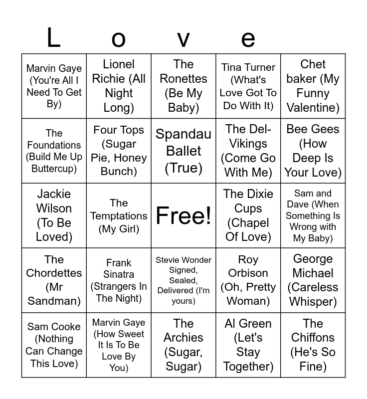 This bingo card has a free space and 29 words: Sam Cooke (Nothing Can Change This Love), Stevie Wonder (My Cherie Amour), The Temptations (My Girl), Etta James (At Last), Marvin Gaye (You're All I Need To Get By), The Ronettes (Be My Baby), Four Tops (Sugar Pie, Honey Bunch), Frank Sinatra (Strangers In The Night), The Dixie Cups (Chapel Of Love), Marvin Gaye (How Sweet It Is To Be Love By You), Sam and Dave (When Something Is Wrong with My Baby), The Chiffons (He's So Fine), The Archies (Sugar, Sugar), Al Green (Let's Stay Together), Bee Gees (How Deep Is Your Love), Marvin Gaye (Let's Get It On), Stevie Wonder Signed, Sealed, Delivered (I'm yours), The Chordettes (Mr Sandman), Chet baker (My Funny Valentine), Jackie Wilson (To Be Loved), Roy Orbison (Oh, Pretty Woman), The Marvelettes (Please Mr. Postman), The Del-Vikings (Come Go With Me), The Foundations (Build Me Up Buttercup), Tina Turner (What's Love Got To Do With It), Lionel Richie (All Night Long), George Michael (Careless Whisper), Spandau Ballet (True) and Madonna (Crazy For You).