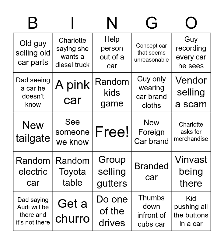 This bingo card has a free space and 24 words: Dad saying Audi will be there and it’s not there, Random Toyota table, Random kids game, Thumbs down infront of cubs car, Guy recording every car he sees, Old guy selling old car parts, Charlotte saying she wants a diesel truck, Help person out of a car, New Foreign Car brand, Charlotte asks for merchandise, New tailgate, A pink car, Branded car, Vinvast being there, Dad seeing a car he doesn’t know, Get a churro, Do one of the drives, Concept car that seems unreasonable, Vendor selling a scam, Random electric car, See someone we know, Group selling gutters, Guy only wearing car brand cloths and Kid pushing all the buttons in a car.