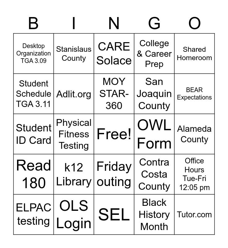 This bingo card has a free space and 26 words: Friday outing, Black History Month, MOY STAR-360, OLS Login, Shared Homeroom, Desktop Organization TGA 3.09, Student Schedule TGA 3.11, Stanislaus County, Alameda County, Contra Costa County, San Joaquin County, Student ID Card, Office Hours Tue-Fri 12:05 pm, ELPAC testing, Physical Fitness Testing, CAR-100, College & Career Prep, Read 180, CARE Solace, Tutor.com, BEAR Expectations, SEL, OWL Form, k12 Library, Adlit.org and unitefor literacy.com.