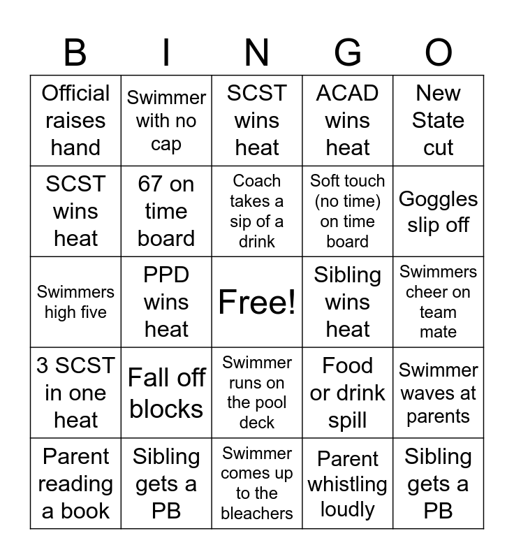 This bingo card has a free space and 24 words: Fall off blocks, Sibling gets a PB, Coach takes a sip of a drink, Parent reading a book, New State cut, Official raises hand, SCST wins heat, Swimmer with no cap, Sibling wins heat, Swimmer runs on the pool deck, Soft touch (no time) on time board, Swimmers high five, Food or drink spill, Swimmer waves at parents, 67 on time board, Parent whistling loudly, Swimmers cheer on team mate, SCST wins heat, Goggles slip off, PPD wins heat, Sibling gets a PB, 3 SCST in one heat, ACAD wins heat and Swimmer comes up to the bleachers.
