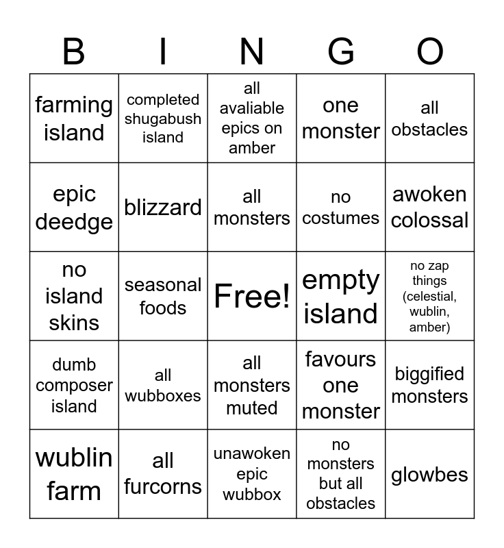 This bingo card has a free space and 24 words: all wubboxes, all furcorns, all monsters, wublin farm, all obstacles, farming island, epic deedge, completed shugabush island, empty island, all monsters muted, no costumes, no island skins, favours one monster, biggified monsters, blizzard, no monsters but all obstacles, no zap things (celestial, wublin, amber), all avaliable epics on amber, awoken colossal, seasonal foods, glowbes, dumb composer island, one monster and unawoken epic wubbox.