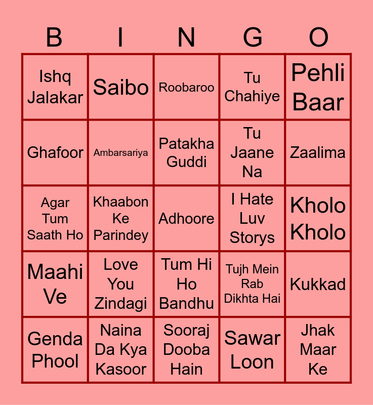 This bingo card has 60 words: Ajab Si, Naina Da Kya Kasoor, Locha-E-Ulfat, Maahi Ve, Sawar Loon, Sawaar Loon, Ambarsariya, Main Agar Kahoon, Tu Jaane Na, Raabta, Tu Chahiye, Uff, Ghafoor, Dildara, Raanjhanaa, Ishq Jalakar, Adhoore, Pehli Baar, Ek Main Aur Ekk Tu, Patakha Guddi, I Hate Luv Storys, Roobaroo, Genda Phool, Kukkad, Bang Bang, For a Reason, Boyfriend, Mann Mera, Zaalima, Tum Hi Ho, Gallan Goodiyan, Cruel Summer, Choo Lo, Shubhaarambh, Saibo, Ishq Wala Love, Pani Da Rang, Khaabon Ke Parindey, Kabhi Kabhi Aditi, Agar Tum Saath Ho, Tum Se Hi, Love You Zindagi, Kholo Kholo, Matargashti, Tujh Mein Rab Dikhta Hai, Socha Hai, Dil Dhadakne Do, Ilahi, Haule Haule, Tum Hi Ho Bandhu, Sooraj Dooba Hain, Deewangi Deewangi, Tumse Mil Ke Dil Ka, Chammak Challo, Mauja Hi Mauja, Subha Hone Na De, Crazy Kiya Re, Hookah Bar, Jhak Maar Ke and Teri Ore.