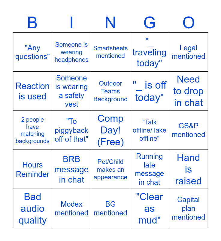 This bingo card has a free space and 32 words: "Clear as mud", "You're on mute", "To piggyback off of that", "Can't hear you", Hours Reminder, Someone is wearing a safety vest, Legal mentioned, Hand is raised, Someone is wearing headphones, Someone is wearing TJX swag, Outdoor Teams Background, Smartsheets mentioned, "To add to that", Ceiling fan in backgroud, "Talk offline/Take offline", Ask someone to go on mute, Bad audio quality, 2 people have matching backgrounds, Pet/Child makes an appearance, BRB message in chat, Running late message in chat, Need to jump to another call in chat, GS&P mentioned, Modex mentioned, Capital plan mentioned, "_ traveling today", "_ is off today", Reaction is used, "Any questions", BG mentioned, Honeywell mentioned and Need to drop in chat.
