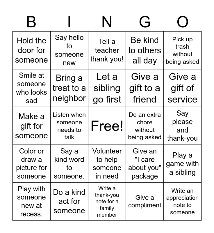 This bingo card has a free space and 24 words: Say a kind word to someone., Do a kind act for someone, Let a sibling go first, Play with someone new at recess., Pick up trash without being asked, Hold the door for someone, Smile at someone who looks sad, Say hello to someone new, Do an extra chore without being asked, Volunteer to help someone in need, Give a gift to a friend, Make a gift for someone, Give an "I care about you" package, Play a game with a sibling, Bring a treat to a neighbor, Give a compliment, Say please and thank-you, Tell a teacher thank you!, Give a gift of service, Listen when someone needs to talk, Write an appreciation note to someone, Color or draw a picture for someone, Be kind to others all day and Write a thank-you note for a family member.