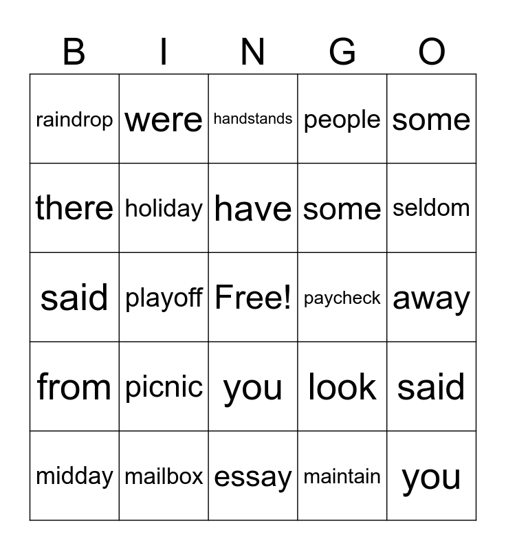This bingo card has a free space and 53 words: have, you, explain, maintain, picnic, maybe, were, crayon, there, railway, holiday, after, said, look, are, midday, have, paycheck, put, some, playoff, my, some, raindrop, waistband, mailbox, of, paintbrush, of, seldom, they, were, people, saw, payday, was, people, essay, handstands, mainland, are, essay, away, from, how, you, raisin, because, said, from, look, was and payment.