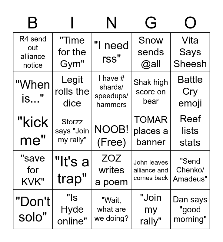 This bingo card has a free space and 32 words: "Join my rally", mefta sends a flower, Storzz says "Join my rally", Blaze says AFK, "save for KVK", Legit rolls the dice, Vita Says Sheesh, "Send Chenko/ Amadeus", "Time for the Gym", Gov promotes Bear Trap 2, I have # shards/ speedups/ hammers, "I need rss", "reinforce", "TP to ___", TOMAR places a banner, "click,heal,click,heal, click,heal,click heal,click....", "Don't solo", "kick me", ZOZ writes a poem, "It's a trap", John leaves alliance and comes back, Mosquito uses cute emoji, Reef lists stats, "Is Hyde online", Dan says "good morning", Snow sends @all, Shak high score on bear, "When is...", R4 send out alliance notice, "Wait, what are we doing?, Lot's of labels and Battle Cry emoji.
