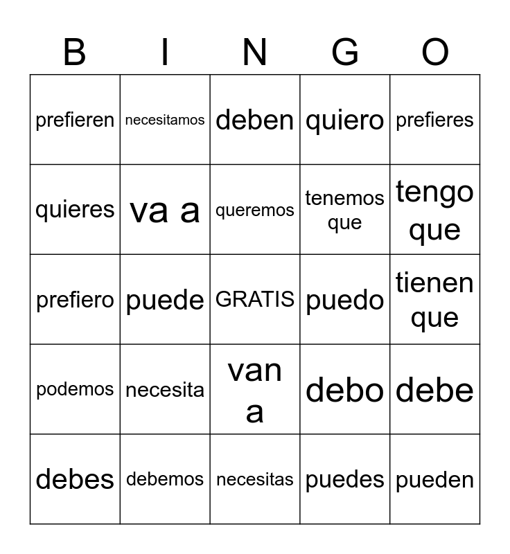 This bingo card has a free space and 35 words: voy a, vas a, vamos a, va a, van a, quiero, quieres, quiere, queremos, quieren, prefiero, prefieres, prefiere, preferimos, prefieren, puedo, puedes, puede, podemos, pueden, debo, debes, debe, debemos, deben, tengo que, tienes que, tiene que, tenemos que, tienen que, necesito, necesitas, necesita, necesitamos and necesitan.