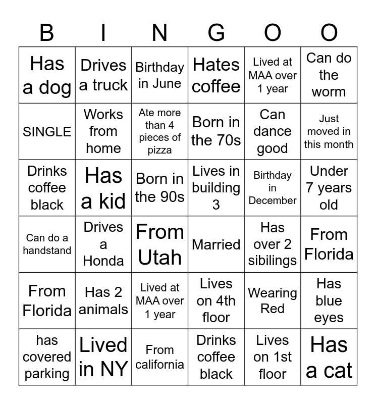 This bingo card has 36 words: Lives on 4th floor, Lived at MAA over 1 year, Drinks coffee black, SINGLE, Can do a handstand, Lives in building 3, Works from home, From california, Lived at MAA over 1 year, Wearing Red, Just moved in this month, Hates coffee, Has blue eyes, Has a kid, Born in the 70s, Has a dog, From Florida, Birthday in December, Drinks coffee black, Birthday in June, Born in the 90s, Drives a Honda, Married, From Utah, Has over 2 sibilings, Drives a truck, Can dance good, Lived in NY, Ate more than 4 pieces of pizza, Can do the worm, Has a cat, has covered parking, From Florida, Under 7 years old, Has 2 animals and Lives on 1st floor.
