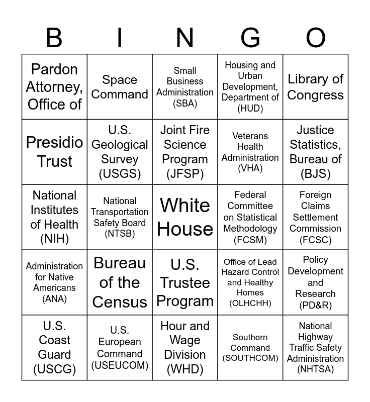 This bingo card has a free space and 597 words: AbilityOne Commission, Access Board, Administration for Children and Families (ACF), Administration for Community Living (ACL), Administration for Native Americans (ANA), Administrative Conference of the United States (ACUS), Administrative Office of the U.S. Courts, Advisory Council on Historic Preservation (ACHP), Africa Command, African Development Foundation (USADF), Agency for Global Media, Agency for Healthcare Research and Quality (AHRQ), Agency for International Development (USAID), Agency for Toxic Substances and Disease Registry (ATSDR), Agricultural Marketing Service (AMS), Agricultural Research Service (ARS), Agriculture Department (USDA), Agriculture Library (NAL), Air Force, Air Force Reserve, Alcohol and Tobacco Tax and Trade Bureau (TTB), Alcohol, Tobacco, Firearms and Explosives Bureau (ATF), Alhurra TV, American Battle Monuments Commission (ABMC), AmeriCorps, AmeriCorps Seniors, Animal and Plant Health Inspection Service (APHIS), Antitrust Division, Appalachian Regional Commission (ARC), Architect of the Capitol, Archives, National Archives and Records Administration (NARA), Arctic Research Commission (USARC), Armed Forces Retirement Home (AFRH), Arms Control and International Security, Army, Army Corps of Engineers, Arthritis, Musculoskeletal and Skin Diseases, National Institute of (NIAMS), Bankruptcy Courts, Barry M. Goldwater Scholarship and Excellence in Education Foundation, Bonneville Power Administration (BPA), Botanic Garden, Bureau of Alcohol and Tobacco Tax and Trade (TTB), Bureau of Alcohol, Tobacco, Firearms and Explosives (ATF), Bureau of Consular Affairs, Bureau of Consumer Financial Protection (CFPB), Bureau of Economic Analysis (BEA), Bureau of Engraving and Printing (BEP), Bureau of Indian Affairs (BIA), Bureau of Industry and Security (BIS), Bureau of International Labor Affairs (ILAB), Bureau of Justice Statistics (BJS), Bureau of Labor Statistics (BLS), Bureau of Land Management (BLM), Bureau of Ocean Energy Management (BOEM), Bureau of Prisons (FBOP), Bureau of Reclamation, Bureau of Safety and Environmental Enforcement (BSEE), Bureau of the Census, Bureau of the Fiscal Service, Bureau of Transportation Statistics (BTS), Capitol Police, Capitol Visitor Center, Career, Technical, and Adult Education, Office of (OCTAE), Census Bureau, Center for Nutrition Policy and Promotion (CNPP), Center for Parent Information and Resources (CPIR), Centers for Disease Control and Prevention (CDC), Centers for Medicare and Medicaid Services (CMS), Central Command (CENTCOM), Central Intelligence Agency (CIA), Chemical Safety Board (CSB), Chief Acquisition Officers Council (CAOC), Chief Financial Officers Council (CFO), Chief Human Capital Officers (CHCO) Council, Chief Information Officers Council, Child Support Enforcement, Office of (OCSS), Circuit Courts of Appeal, Citizens' Stamp Advisory Committee (CSAC), Citizenship and Immigration Services (USCIS), Civil Rights Division, Department of Justice, Civil Rights, Department of Education Office of (OCR), Civil Rights, Department of Health and Human Services Office for, Coast Guard (USCG), Commerce Department (DOC), Commission of Fine Arts, Commission on Civil Rights (USCCR), Commission on International Religious Freedom (USCIRF), Commission on Presidential Scholars, Commission on Security and Cooperation in Europe (Helsinki Commission), Committee on Foreign Investment in the United States (CFIUS), Commodity Futures Trading Commission (CFTC), Community Oriented Policing Services (COPS), Community Planning and Development (CPD), Comptroller of the Currency, Office of (OCC), Congress—U.S. House of Representatives, Congress—U.S. Senate, Congressional Budget Office (CBO), Congressional Research Service (CRS), Congressional Workplace Rights, Office of (OCWR), Consular Affairs, Bureau of, Consumer Financial Protection Bureau (CFPB), Consumer Product Safety Commission (CPSC), Coordinating Council on Juvenile Justice and Delinquency Prevention, Copyright Office, Corps of Engineers, Council of Economic Advisers (CEA), Council of the Inspectors General on Integrity and Efficiency (CIGIE), Council on Environmental Quality (CEQ), Court of Appeals for the Armed Forces, Court of Appeals for the Federal Circuit, Court of Appeals for Veterans Claims, Court of Federal Claims, Court of International Trade, Court Services and Offender Supervision Agency for the District of Columbia (CSOSA), Customs and Border Protection (CBP), Cyber Command, Cybersecurity and Infrastructure Security Agency (CISA), Debt and Claims Management Center, Defense Advanced Research Projects Agency (DARPA), Defense Commissary Agency, Defense Contract Audit Agency (DCAA), Defense Contract Management Agency (DCMA), Defense Counterintelligence and Security Agency (DCSA), Defense Department (DOD), Defense Finance and Accounting Service (DFAS), Defense Finance and Accounting Service Debt and Claims Management Center, Defense Health Agency (DHA), Defense Information Systems Agency (DISA), Defense Intelligence Agency (DIA), Defense Logistics Agency (DLA), Defense Nuclear Facilities Safety Board (DNFSB), Defense POW/MIA Accounting Agency (DPAA), Defense Security Cooperation Agency (DSCA), Defense Technical Information Center (DTIC), Defense Threat Reduction Agency (DTRA), Delaware River Basin Commission (DRBC), Delta Regional Authority (DRA), Denali Commission, Department of Agriculture (USDA), Department of Commerce (DOC), Department of Defense (DOD), Department of Education (ED), Department of Energy (DOE), Department of Energy’s Office of Science, Department of Health and Human Services (HHS), Department of Homeland Security (DHS), Department of Housing and Urban Development (HUD), Department of Justice (DOJ), Department of Labor (DOL), Department of State (DOS), Department of the Interior (DOI), Department of the Treasury, Department of Transportation (DOT), Department of Veterans Affairs (VA), Director of Natio