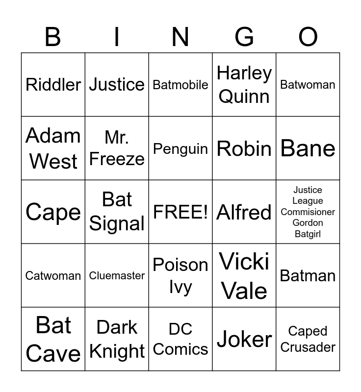 This bingo card has a free space and 28 words: Batman, Gotham, Robin, Joker, Adam West, Batmobile, Justice, Catwoman, Alfred, Bat Cave, Cape, Harley Quinn, Dark Knight, DC Comics, Bane, Clayface, Cluemaster, Mr. Freeze, Penguin, Poison Ivy, Riddler, Bruce Wayne, Caped Crusader, Bat Signal, Justice League Commisioner Gordon Batgirl, Vicki Vale, Batwoman and Superhero.