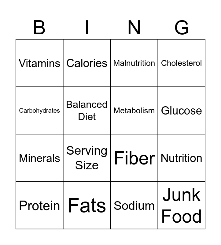 This bingo card has 20 words: Nutrition, Dehydration, Malnutrition, Nutrients, Protein, Carbohydrates, Fats, Vitamins, Minerals, Calories, Serving Size, Fiber, Balanced Diet, Junk Food, Metabolism, Obesity, Glucose, Cholesterol, Sodium and Processed Foods.
