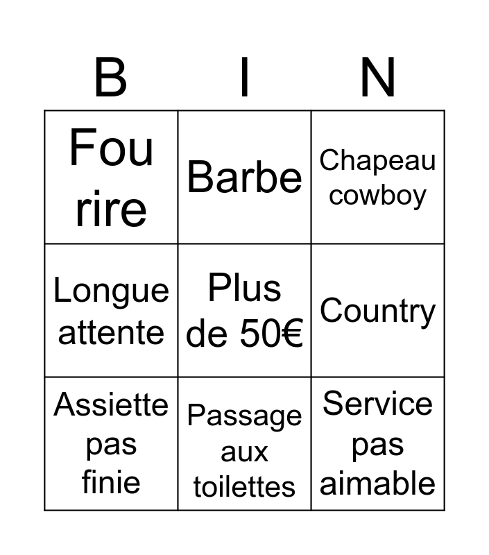 This bingo card has a free space and 8 words: Country, Chapeau cowboy, Barbe, Assiette pas finie, Fou rire, Service pas aimable, Longue attente and Passage aux toilettes.