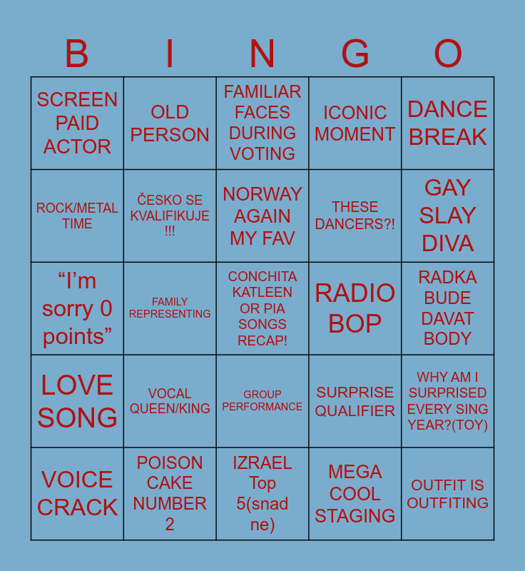 This bingo card has a free space and 24 words: VOCAL QUEEN/KING, POISON CAKE NUMBER 2, NORWAY AGAIN MY FAV, VOICE CRACK, DANCE BREAK, SCREEN PAID ACTOR, ROCK/METAL TIME, OLD PERSON, RADIO BOP, GROUP PERFORMANCE, THESE DANCERS?!, “I’m sorry 0 points”, SURPRISE QUALIFIER, WHY AM I SURPRISED EVERY SING YEAR?(TOY), ČESKO SE KVALIFIKUJE !!!, MEGA COOL STAGING, RADKA BUDE DAVAT BODY, FAMILIAR FACES DURING VOTING, GAY SLAY DIVA, FAMILY REPRESENTING, OUTFIT IS OUTFITING, LOVE SONG, ICONIC MOMENT and IZRAEL Top 5(snad ne).