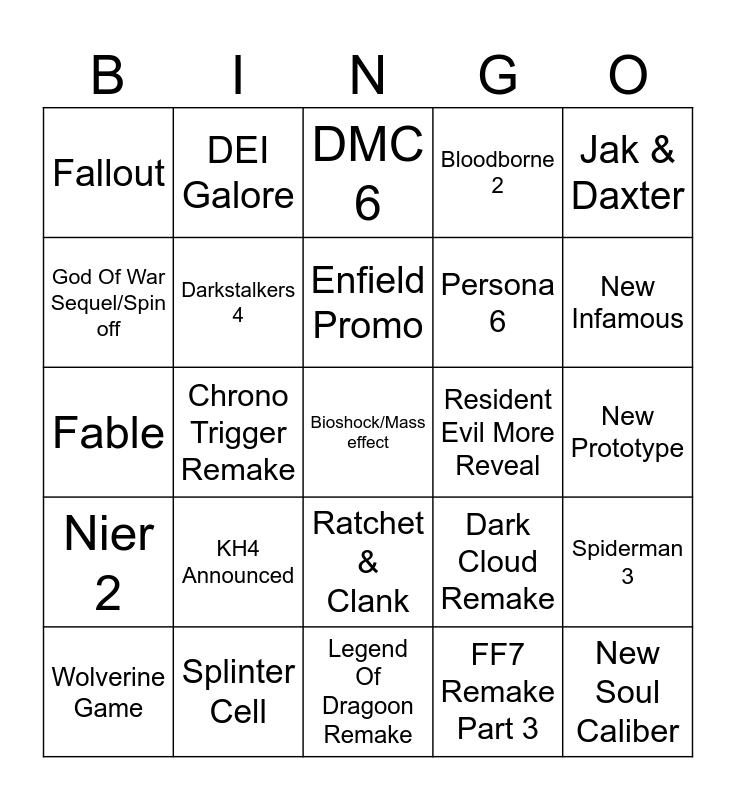 This bingo card has a free space and 24 words: KH4 Announced, Splinter Cell, Enfield Promo, Wolverine Game, Jak & Daxter, Fallout, God Of War Sequel/Spin off, DEI Galore, Resident Evil More Reveal, Ratchet & Clank, Persona 6, Fable, Dark Cloud Remake, Spiderman 3, Darkstalkers 4, FF7 Remake Part 3, New Prototype, DMC 6, New Infamous, Chrono Trigger Remake, New Soul Caliber, Nier 2, Bloodborne 2 and Legend Of Dragoon Remake.