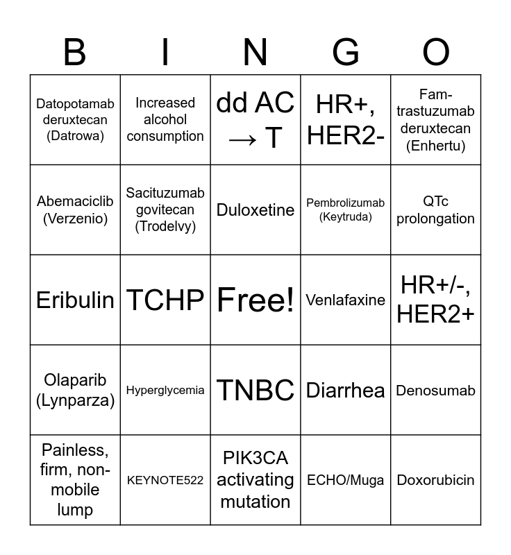 This bingo card has a free space and 29 words: Age >60, KEYNOTE522, dd AC → T, AI + CDK 4/6 inhibitor, Fam-trastuzumab deruxtecan (Enhertu), Datopotamab deruxtecan (Datrowa), Sacituzumab govitecan (Trodelvy), Duloxetine, Venlafaxine, Denosumab, Painless, firm, non-mobile lump, TCHP, ECHO/Muga, Doxorubicin, Eribulin, Tamoxifen, PIK3CA activating mutation, Diarrhea, QTc prolongation, Olaparib (Lynparza), Hyperglycemia, Capecitabine (Xeloda), Pembrolizumab (Keytruda), HR+/-, HER2+, Abemaciclib (Verzenio), Increased alcohol consumption, TNBC, HR+, HER2- and Ribociclib (Kisqali).
