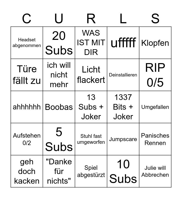 This bingo card has 25 words: 5 Subs, Spiel abgestürzt, Licht flackert, geh doch kacken, Klopfen, Headset abgenommen, Türe fällt zu, 20 Subs, 1337 Bits + Joker, Stuhl fast umgeworfen, Deinstallieren, ahhhhhh, Jumpscare, Panisches Rennen, ich will nicht mehr, Julie will Abbrechen, Umgefallen, WAS IST MIT DIR, RIP 0/5, Boobas, 13 Subs + Joker, "Danke für nichts", Aufstehen 0/2, ufffff and 10 Subs.