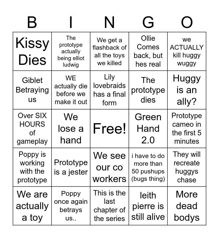 This bingo card has a free space and 24 words: Prototype is a jester, Poppy once again betrays us.., Lily lovebraids has a final form, We are actually a toy, we ACTUALLY kill huggy wuggy, Kissy Dies, Giblet Betraying us, The prototype actually being elliot ludwig, Green Hand 2.0, We see our co workers, The prototype dies, Over SIX HOURS of gameplay, i have to do more than 50 pushups (bugs thing), They will recreate huggys chase, WE actually die before we make it out, leith pierre is still alive, Prototype cameo in the first 5 minutes, We get a flashback of all the toys we killed, Huggy is an ally?, We lose a hand, More dead bodys, Poppy is working with the prototype, Ollie Comes back, but hes real and This is the last chapter of the series.