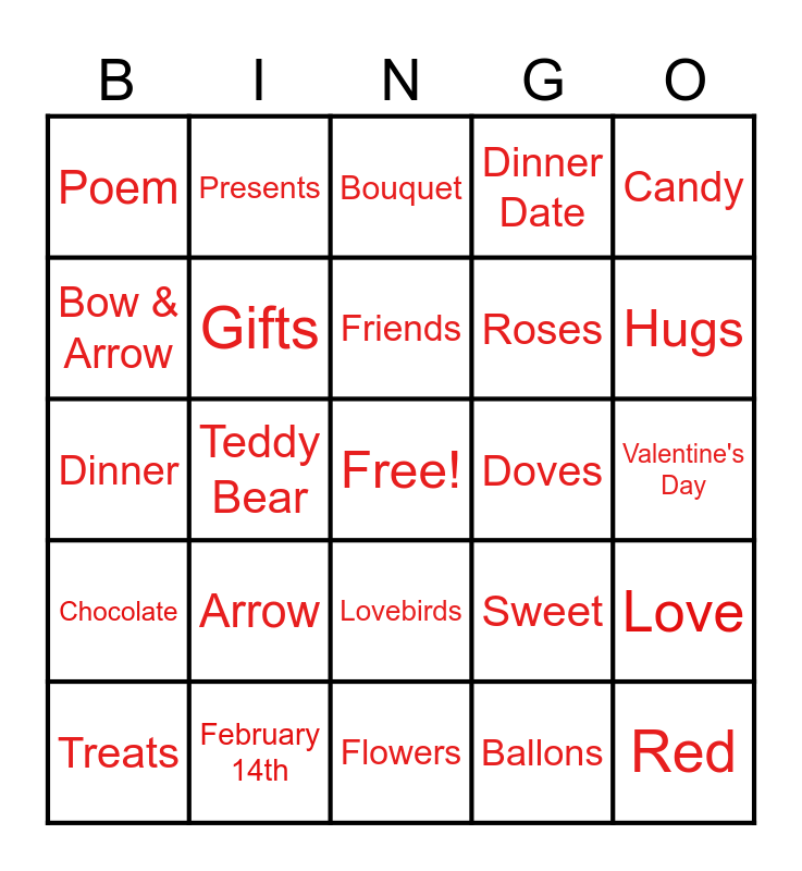 This bingo card has a free space and 29 words: Heart, February 14th, Bouquet, Valentine's Day Card, Candy, Poem, Gifts, Friends, Doves, Love, Treats, Teddy Bear, Ballons, Red, Dinner, Cupid, Flowers, Sweet, Hugs, Chocolate, Arrow, Pink, Roses, Valentine's Day, Bow & Arrow, Presents, Lovebirds, Dinner Date and Bouquet.