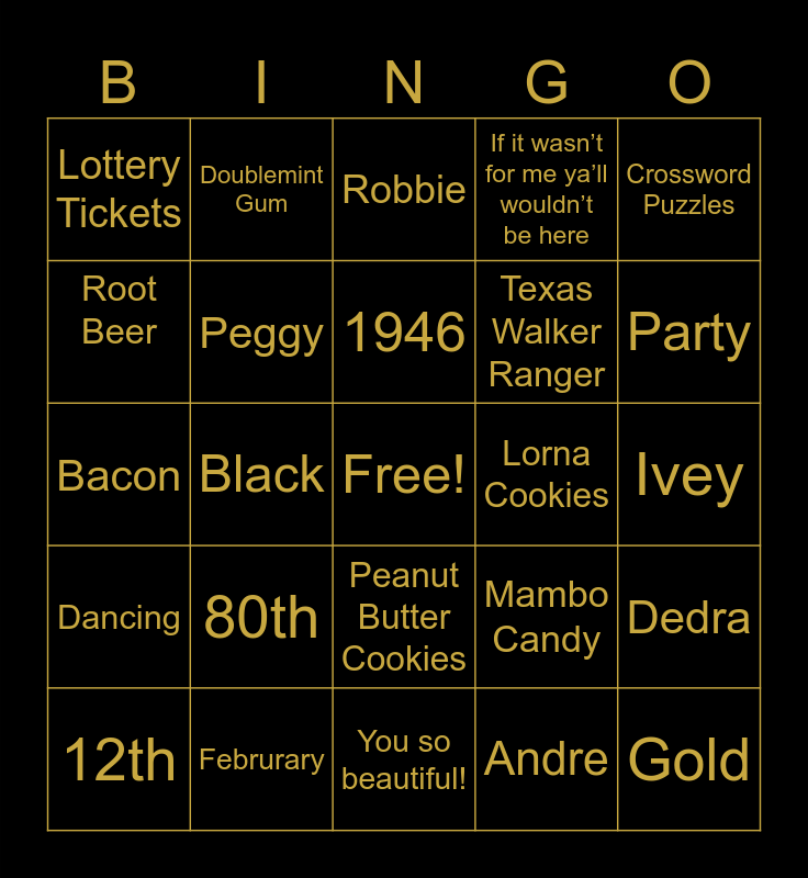 This bingo card has a free space and 24 words: 80th, Februrary, 1946, 12th, Crossword Puzzles, Lottery Tickets, Root Beer, Doublemint Gum, Lorna Cookies, Peanut Butter Cookies, Texas Walker Ranger, Bacon, Mambo Candy, Dedra, Peggy, Andre, Ivey, Robbie, Party, Black, Gold, Dancing, If it wasn’t for me ya’ll wouldn’t be here and You so beautiful!.