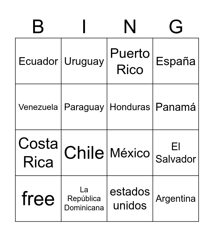 This bingo card has 23 words: Argentina, Colombia, Panamá, Perú, Venezuela, Ecuador, Paraguay, Uruguay, free, Bolivia, Chile, Costa Rica, Nicaragua, Guatemala, La República Dominicana, Cuba, Puerto Rico, México, Honduras, El Salvador, España, estados unidos and Guinea ecuatorial.
