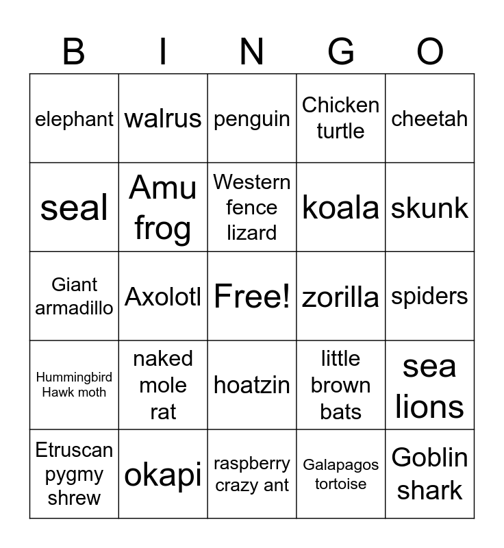 This bingo card has a free space and 24 words: naked mole rat, okapi, Western fence lizard, Etruscan pygmy shrew, cheetah, elephant, seal, walrus, zorilla, hoatzin, koala, Giant armadillo, little brown bats, sea lions, Amu frog, Galapagos tortoise, spiders, penguin, skunk, Axolotl, Goblin shark, Hummingbird Hawk moth, Chicken turtle and raspberry crazy ant.
