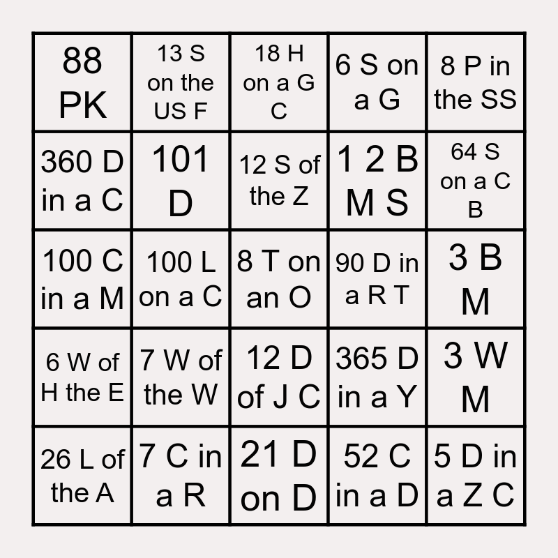 This bingo card has a free space and 24 words: 26 L of the A, 7 W of the W, 12 S of the Z, 52 C in a D, 8 P in the SS, 88 PK, 13 S on the US F, 18 H on a G C, 90 D in a R T, 3 B M, 100 C in a M, 101 D, 365 D in a Y, 3 W M, 360 D in a C, 7 C in a R, 21 D on D, 6 S on a G, 64 S on a C B, 6 W of H the E, 100 L on a C, 12 D of J C, 1 2 B M S and 5 D in a Z C.