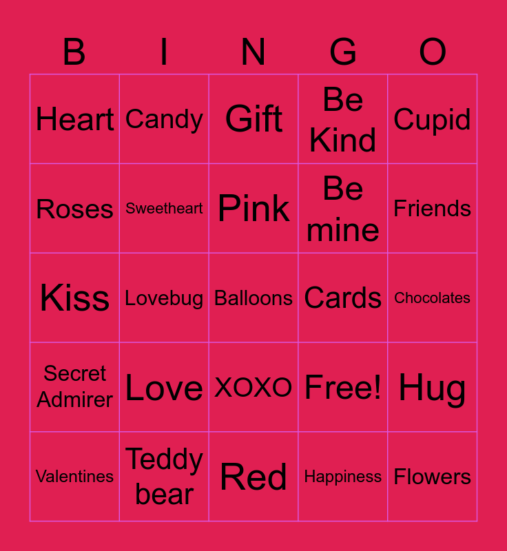 This bingo card has 25 words: Love, Red, Pink, Valentines, Cupid, Heart, Roses, Candy, Cards, XOXO, Be mine, Kiss, Free!, Hug, Sweetheart, Flowers, Chocolates, Gift, Friends, Lovebug, Balloons, Teddy bear, Secret Admirer, Be Kind and Happiness.