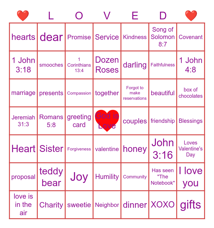 This bingo card has a free space and 143 words: February Birthday, Has written a love letter, Bought expensive jewelry, Buys chocolate 50% off on 2/15, Loves Valentine's Day, Forgot to make reservations, Homemade Present, Watches "Married at 1st sight", Loves romantic comedies, Makes homemade cards, Buys Valentine's Day gifts for pets, "Love and Basketball" 5+ times, Still hasn't bought a present, Cooked at home, Has received a letter, Wearing red or pink, honey, husband, hugs, date, Has seen "The Notebook", beautiful, couples, crush, cuddle, darling, dear, feelings, forever, friend, friendship, handsome, I love you, marriage, proposal, romance, romantic, admirer, smooches, soulmates, sweetie, sweetheart, together, true love, wife, XOXO, kisses, love, love is in the air, lovers, flowers, dinner, box of chocolates, candy, card, celebrate, cookies, decorations, diamonds, forget-me-nots, gifts, greeting card, jewelry, love letter, poem, presents, roses, ribbons, ring, teddy bear, valentine, hearts, Dozen Roses, Agape, Family, Friendship, Beloved, Heart, Service, Charity, 1 Corinthians 13, Blessing, Light, John 3:16, 1 Corinthians 13:4, 1 Corinthians 13:13, 1 John 4:8, 1 John 4:19, Romans 5:8, John 13:34, Romans 12:10, Colossians 3:14, Proverbs 10:12, Jeremiah 31:3, Deuteronomy 6:5, 1 Peter 4:8, Ephesians 4:2, Galatians 5:13, Micah 6:8, Psalm 136:26, Song of Solomon 8:7, Luke 6:31, Matthew 22:39, John 15:13, 1 John 3:18, Romans 13:10, Ephesians 5:2, Psalm 63:3, Love, Compassion, Mercy, Grace, Kindness, Faithfulness, Devotion, Covenant, Forgiveness, Sacrifice, Unity, Peace, Joy, Patience, Gentleness, Humility, Selfless, Serving, Giving, Caring, Trust, Commitment, Faith, Marriage, Friends, Fellowship, Community, Neighbor, Brother, Sister, Promise, Blessings, Hope, Together and Forever.