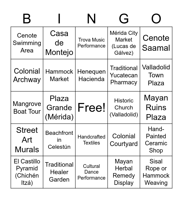 This bingo card has a free space and 33 words: Flamingos in Celestún, Mérida Cathedral, Plaza Grande (Mérida), Paseo de Montejo Mansions, Street Art Murals, Hammock Market, Cenote Saamal, El Castillo Pyramid (Chichén Itzá), Casa de Montejo, Local Fruit Market, Henequen Hacienda, Trova Music Performance, Mayan Glyphs, Souvenir Market, Historic Church (Valladolid), Valladolid Town Plaza, Traditional Healer Garden, Mangrove Boat Tour, Beachfront in Celestún, Colonial Courtyard, Handcrafted Textiles, Yucatán Street Food Stand, Cenote Swimming Area, Mayan Ruins Plaza, Cultural Dance Performance, Sisal Rope or Hammock Weaving, Mérida City Market (Lucas de Gálvez), Traditional Yucatecan Pharmacy, Colonial Archway, Hand-Painted Ceramic Shop, Local Bus or Colectivo Station, Mayan Herbal Remedy Display and Public Plaza Evening Performance.