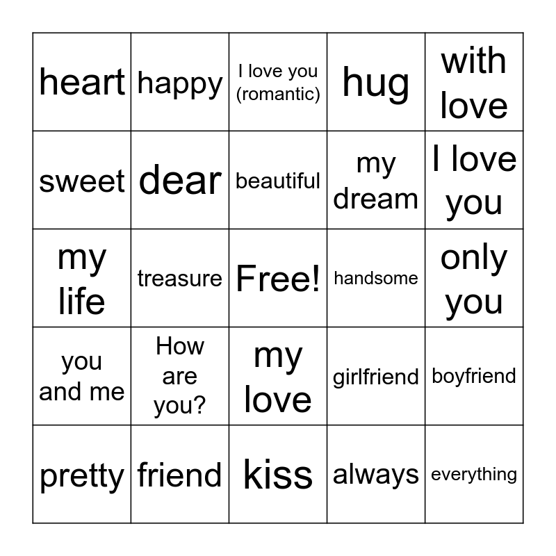 This bingo card has a free space and 24 words: How are you?, friend, beautiful, pretty, with love, heart, sweet, happy, handsome, my love, my dream, my life, girlfriend, boyfriend, dear, always, only you, I love you (romantic), I love you, treasure, everything, you and me, hug and kiss.