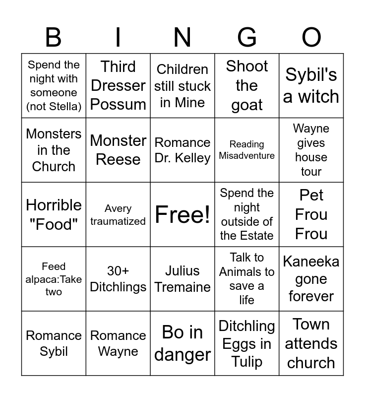 This bingo card has a free space and 24 words: 30+ Ditchlings, Romance Wayne, Romance Dr. Kelley, Romance Sybil, Sybil's a witch, Spend the night with someone (not Stella), Monsters in the Church, Third Dresser Possum, Spend the night outside of the Estate, Julius Tremaine, Reading Misadventure, Horrible "Food", Talk to Animals to save a life, Kaneeka gone forever, Monster Reese, Ditchling Eggs in Tulip, Pet Frou Frou, Children still stuck in Mine, Wayne gives house tour, Avery traumatized, Town attends church, Feed alpaca:Take two, Shoot the goat and Bo in danger.