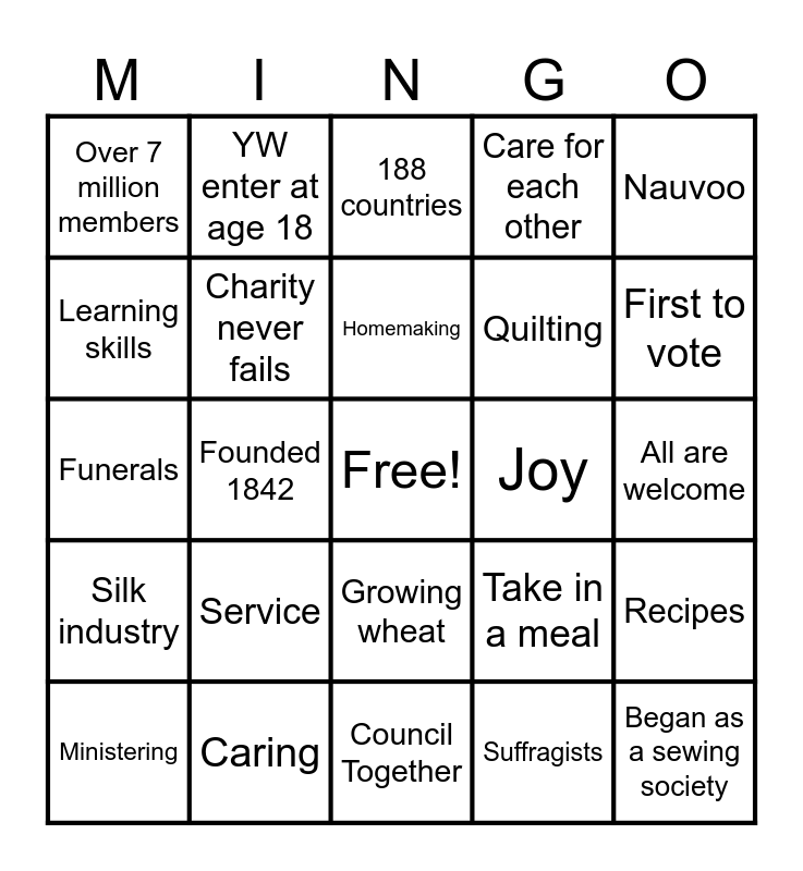 This bingo card has a free space and 29 words: Ministering, Birthday March 17, Founded 1842, Emma Smith, Over 7 million members, 188 countries, Charity never fails, Service, Joy, Caring, All are welcome, Began as a sewing society, Council Together, Suffragists, First to vote, Medical school, Growing wheat, Silk industry, Nauvoo, Funerals, Take in a meal, Fun activities, Quilting, Learning skills, Care for each other, YW enter at age 18, Recipes, Homemaking and Love.