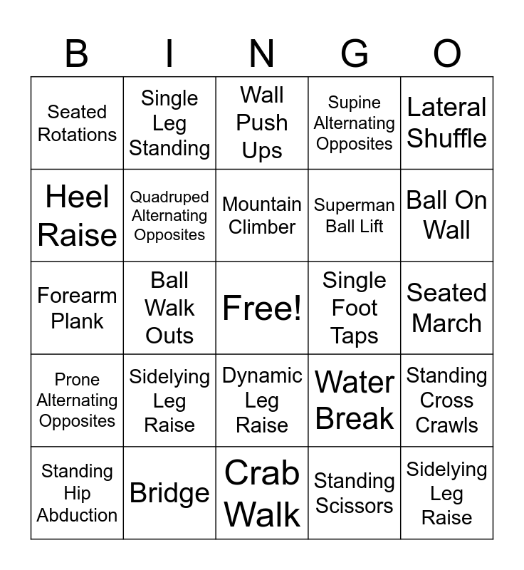This bingo card has a free space and 24 words: Sidelying Leg Raise, Bridge, Mountain Climber, Standing Hip Abduction, Lateral Shuffle, Seated Rotations, Heel Raise, Single Leg Standing, Single Foot Taps, Dynamic Leg Raise, Superman Ball Lift, Forearm Plank, Water Break, Standing Cross Crawls, Quadruped Alternating Opposites, Standing Scissors, Seated March, Wall Push Ups, Ball On Wall, Ball Walk Outs, Sidelying Leg Raise, Prone Alternating Opposites, Supine Alternating Opposites and Crab Walk.