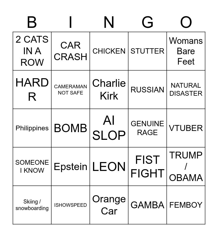 This bingo card has 25 words: Epstein, Orange Car, Charlie Kirk, Skiing / snowboarding, Womans Bare Feet, 2 CATS IN A ROW, HARD R, CAR CRASH, GENUINE RAGE, LEON, RUSSIAN, Philippines, FIST FIGHT, TRUMP / OBAMA, CAMERAMAN NOT SAFE, FEMBOY, VTUBER, CHICKEN, NATURAL DISASTER, BOMB, AI SLOP, ISHOWSPEED, SOMEONE I KNOW, STUTTER and GAMBA.