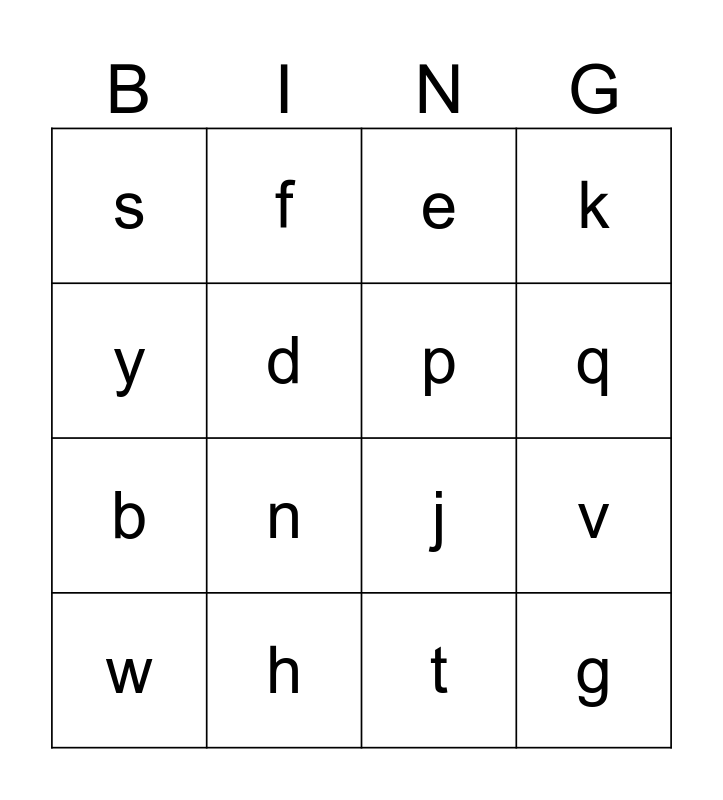This bingo card has 27 words: Free!, a, b, c, d, e, f, g, h, i, j, k, l, m, n, o, p, q, r, s, t, u, v, w, x, y and z.
