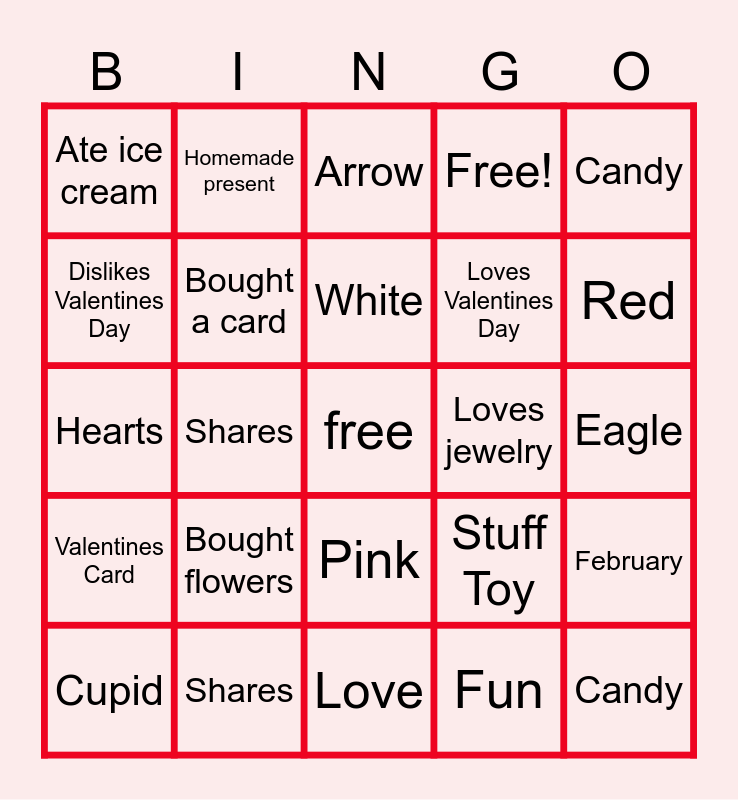 This bingo card has a free space and 28 words: February, Flowers, Loves Valentines Day, Fun, Dislikes Valentines Day, Arrow, Homemade present, Valentines Card, Loves jewelry, Cupid, Hearts, Free!, Shares, Love, Red, Ate chocolate today, Bought flowers, Bought a card, White, Pink, Ate ice cream, Stuffed toy, Candy, Shares, Eagle, Stuff Toy, Candy and Chocolate.