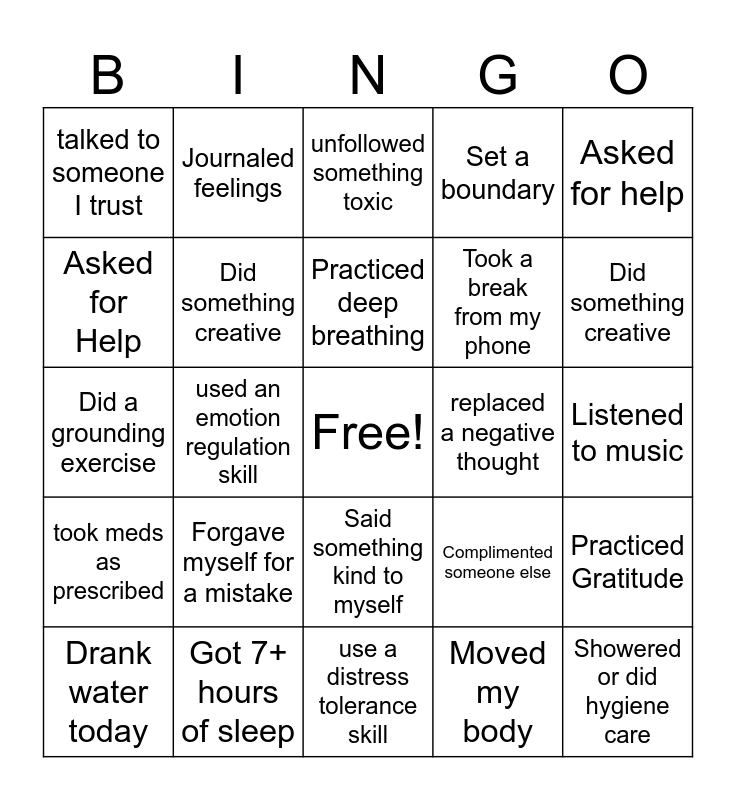 This bingo card has a free space and 24 words: Forgave myself for a mistake, Got 7+ hours of sleep, Practiced deep breathing, Drank water today, Asked for help, talked to someone I trust, Asked for Help, Journaled feelings, replaced a negative thought, Said something kind to myself, Took a break from my phone, Did a grounding exercise, Complimented someone else, Practiced Gratitude, Did something creative, Moved my body, Listened to music, unfollowed something toxic, Did something creative, used an emotion regulation skill, Showered or did hygiene care, took meds as prescribed, Set a boundary and use a distress tolerance skill.
