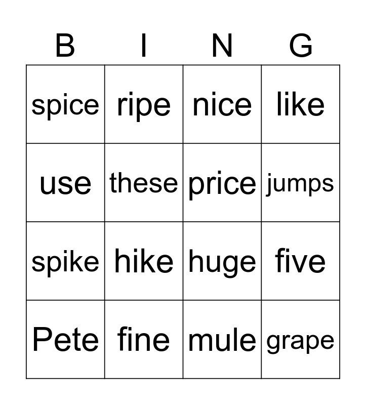 This bingo card has 16 words: fine, five, nice, spice, spike, ripe, huge, mule, use, these, Pete, like, hike, jumps, price and grape.