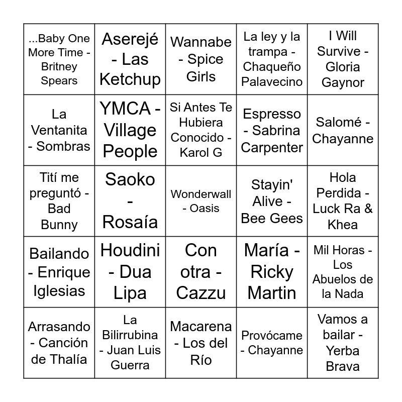 This bingo card has 25 words: Bailando - Enrique Iglesias, La Bilirrubina - Juan Luis Guerra, Wonderwall - Oasis, Provócame - Chayanne, I Will Survive - Gloria Gaynor, ...Baby One More Time - Britney Spears, Aserejé - Las Ketchup, Wannabe - Spice Girls, Stayin' Alive - Bee Gees, Mil Horas - Los Abuelos de la Nada, La Ventanita - Sombras, YMCA - Village People, Macarena - Los del Río, María - Ricky Martin, Salomé - Chayanne, Arrasando - Canción de Thalía, Saoko - Rosaía, Si Antes Te Hubiera Conocido - Karol G, Espresso - Sabrina Carpenter, Hola Perdida - Luck Ra & Khea, Tití me preguntó - Bad Bunny, Houdini - Dua Lipa, Con otra - Cazzu, La ley y la trampa - Chaqueño Palavecino and Vamos a bailar - Yerba Brava.